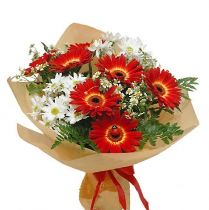 Презентабельный букет из гербер и хризантем с добавлением ромашки, украшеный папоротником.