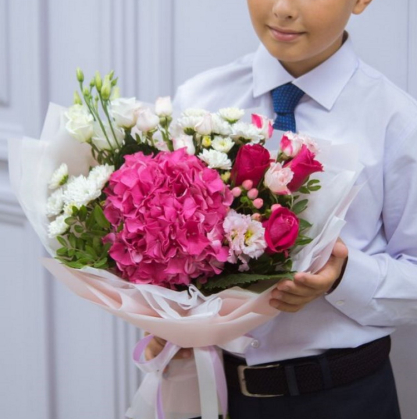 Хотите, чтобы Ваш ребенок выделялся на 1 сентября? Красивая композиция из гортензий, роз, хризантем, лизиантусов и гиперикума.