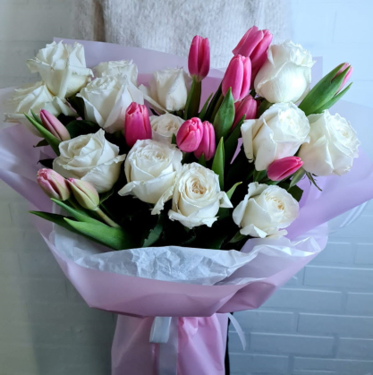 Букет сочетает в себе красоту роз и нежность тюльпанов розовых оттенков, создающие легкую атмосферу весны. В этом букете цветы идеально дополняют друг друга, создавая прекрасный контраст цветов и форм.