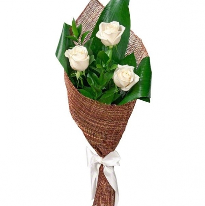 Стильный букет из белых роз оформленный зеленью в натуральной упаковке!