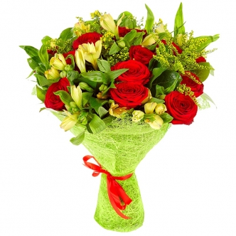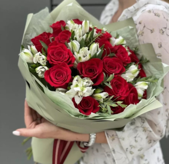 - Альстромерия и розы: Классическое и элегантное сочетание, добавляющее букету объема и роскоши.