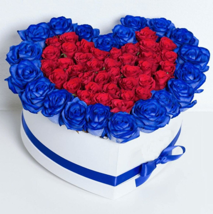 Невероятная по своей красоте коробка! Окантовка из синих роз, по центру красные.