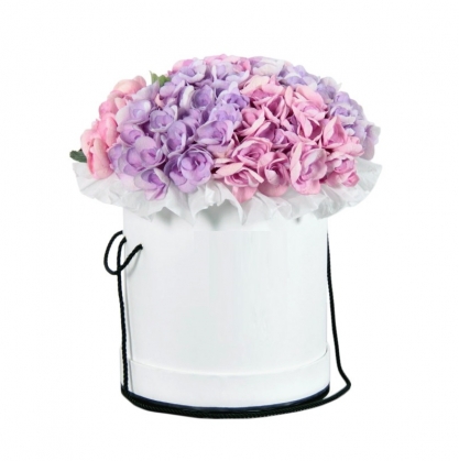 Микс из нежных гортензий в шляпной коробке. Цвета уточняйте у менеджера по телефону.