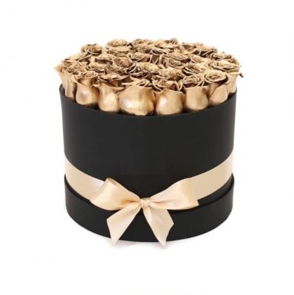 Золотые розы в черной шляной коробке с доставкой в Пушкино