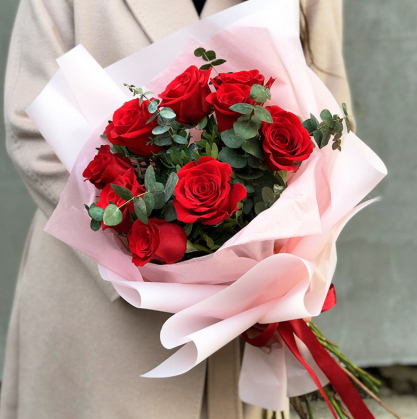 Розы сорта Фридом и эвкалипт baby blue идеально подходят друг к другу. Эвкалипт добавляет текстуру и контраст к красочным розам, а также придает букету естественный вид.