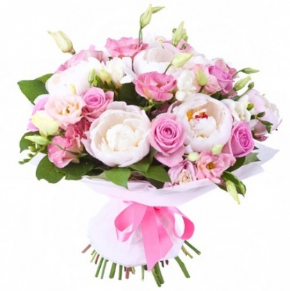 Сборный букет из фрезий, пионов, роз и эустомы