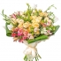 Красочный букет из альстромерий, кустовых роз, эустомы и солидаго с добавлением аспидистры
