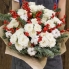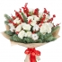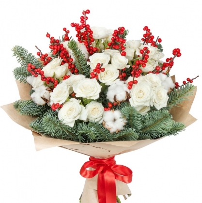 Букет в красно-белых тонах из кустовой розы, ярких ягод илекса (возможна замена на гипперикум) и пихты обладает чудесным зимним колоритом, а также тонким ароматом. Такой букет станет приятным подарком для дорогого вам человека как в Новый Год, так и на любой другой праздник. Круглый букет собран в европейском стиле.